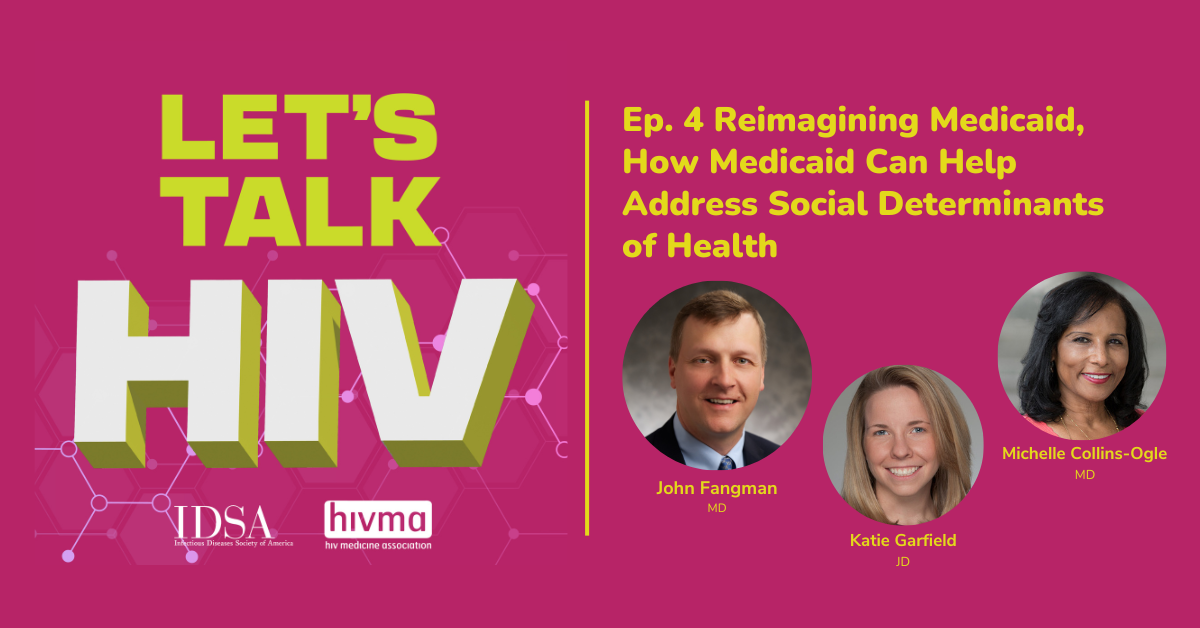 John Fangman: [00:00:12] Hello everyone! We are excited to welcome you to the HIV Medicine Association's podcast series, Let's Talk HIV. Why Medicaid matters. This podcast series covers the ins and outs of Medicaid, the federal health care program that provides care for millions of low-income Americans. I'm your host, Dr. John Fangman, an infectious disease physician at Mass General Brigham in Boston and an HIVMA member. This podcast episode will dive into how Medicaid is evolving when it comes to meeting patients’ non-clinical needs related to social determinants of health, and what this means for people living with HIV. We're happy to welcome two extraordinary guests with us today who are true experts in this topic. Katie Garfield is the director of Whole Person Care and a clinical instructor at Harvard Law School's Center of Health Law and Policy Innovation. Welcome, Katie.