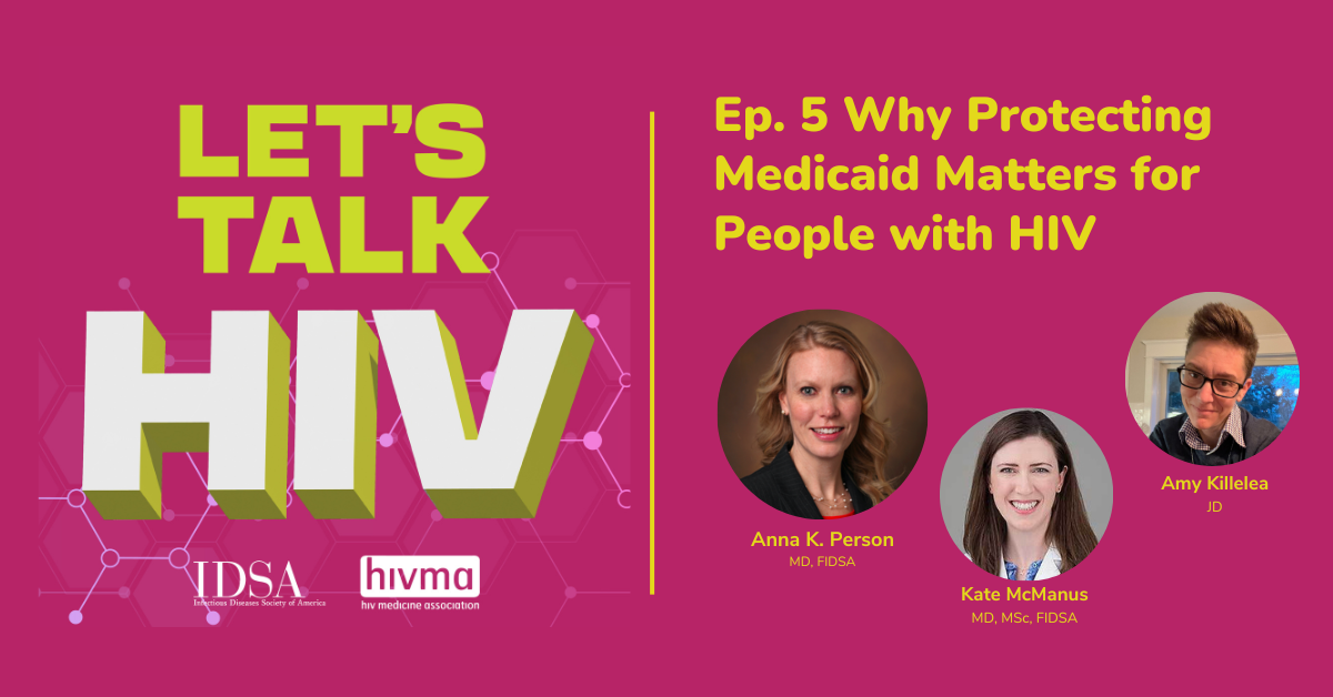 Anna Pearson: [00:00:11] Hello everyone! We are excited to welcome you to the next installment of HIV Medicine Association's podcast series, Let's Talk HIV. Why Medicaid matters. I'm your host, doctor Anna Pearson, an infectious disease doctor at Vanderbilt University Medical Center and HIV EMA vice chair. And this podcast series really serves to build off of four episodes that you may recall were recorded last year and will further delve into the emerging threats to the Medicaid program and how infectious diseases and HIV care professionals can really support Medicaid as a critical safety net for people with HIV.